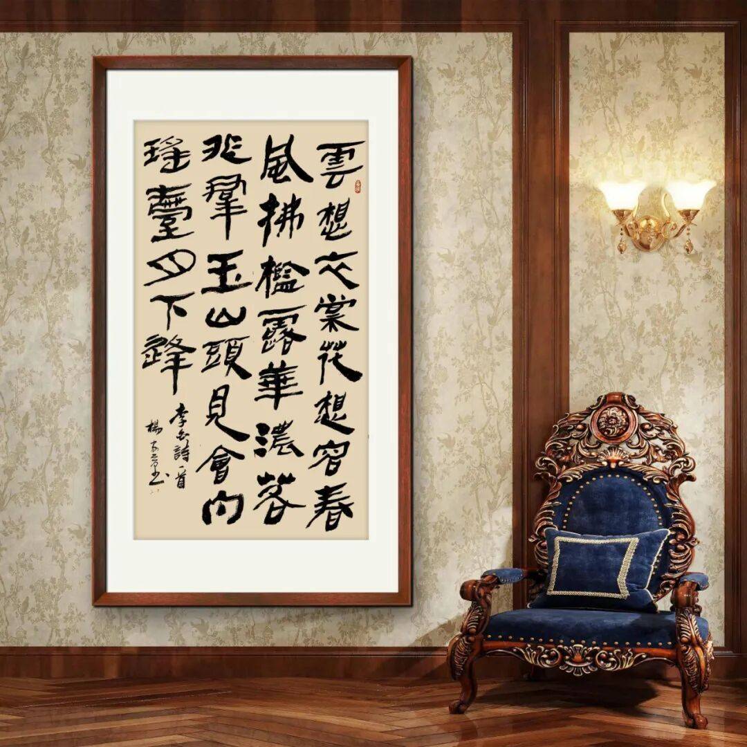 杨家育先先生的书法作品,字体古朴厚重,笔画遒劲有力,尽显书法艺术的独特魅力。书写的内容为李白的诗,在笔墨的演绎下,诗句的意境仿佛也随之流淌而出,既展现了书写者对书法技艺的娴熟掌控,也传递出古典诗词与书法艺术融合的美感,给人以视觉与文化的双重享受。