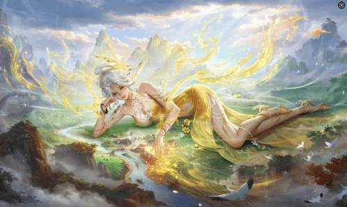 整幅画面以武茗山为背景,金色霞光轻柔笼罩山峦,“御山司茗·忘忧”俯卧于云雾缭绕的山脊之间,神情宁静而慈悲,仿佛默默守护着脚下那片茶园与零星散布的民居。她身披素雅流云仙衣,发间别着三支造型别致的发簪——这或许正是背景故事中提到的“山水雾三刃”的化身。小镇炊烟渺渺,田间茶枝轻摇,整体氛围透出一股静谧而神圣的守护之意。