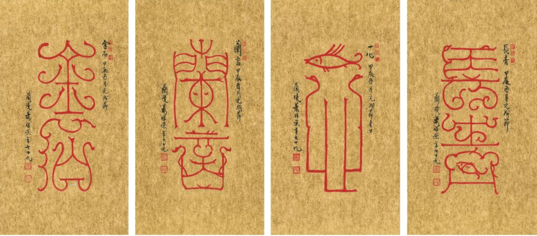 萧晖荣《金石 蘭言 一心 長青》 (鳥蟲篆書) 設色金卡紙 30.5×20.5cm×4 2024年作
