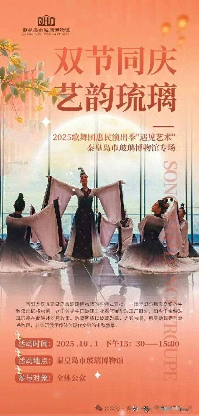 作为文化惠民工程的重要组成部分,本次演出面向全体市民及游客免费开放。这个金秋,让我们在玻璃的流光溢彩中遇见艺术,在歌舞的动人旋律中欢度双节。10 月 1 日,秦皇岛市玻璃博物馆邀您共赴这场文化之约,让艺术之美点亮家国团圆的温馨时刻!