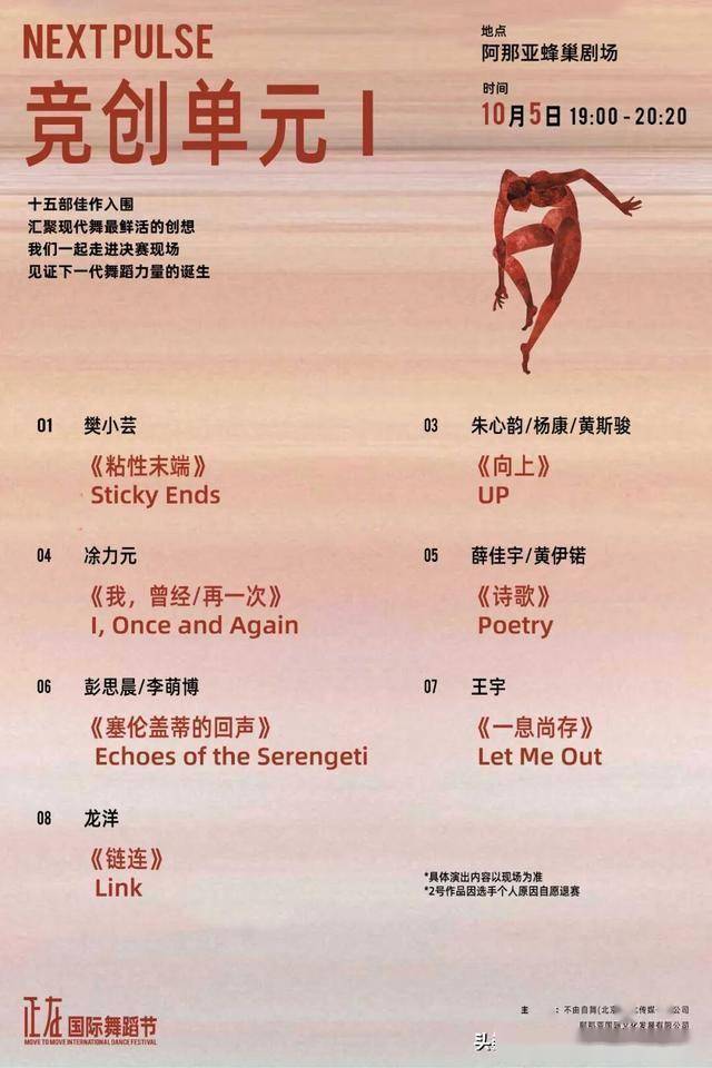 「竞创单元」是本届舞蹈节全新开创的舞蹈创作竞赛与展演平台,该版块16部入围作品从百余部中选出,将于2025年10月5-6日现场竞逐最终奖项。