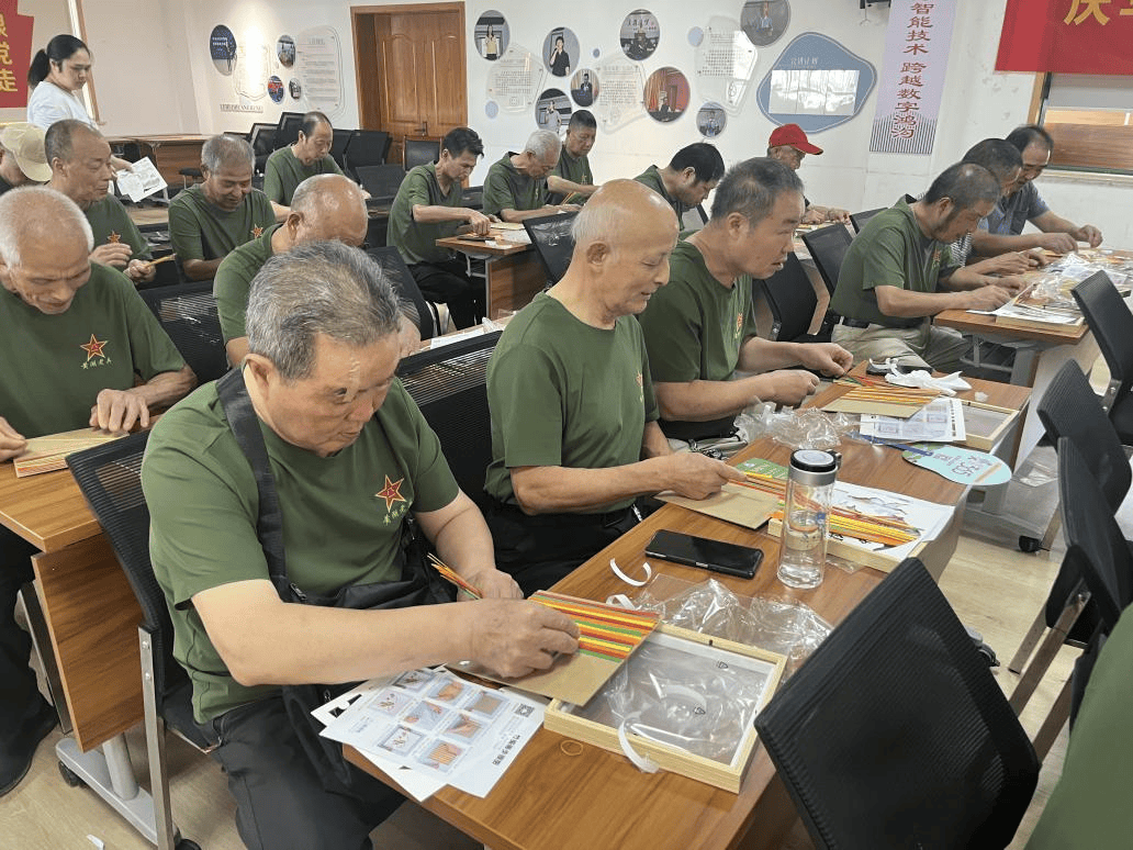 随后进入竹编画制作环节。工作人员为每位参与者准备了精心搭配的竹编材料包,志愿者耐心讲解、细致辅助,老兵们很快掌握编织技巧,纷纷动手创作。大家边编织边交流,回忆军旅生涯,现场爱国情与战友情交融。作品完成后,老兵们展示成果,成为活动中一道亮丽风景。