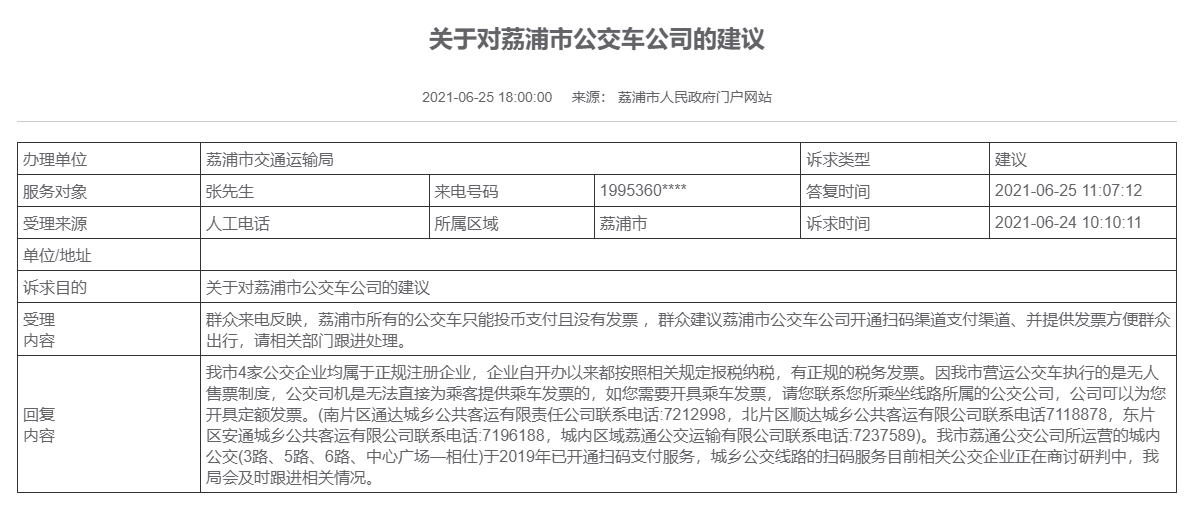 2021年,也有村民投诉称,荔浦市诸多公交只能投币支付且没有发票。荔浦市交通运输局回应称其市4家公交企业有正规税务发票,如需开具需联系公司,此外,市荔通公交公司所运营的城内公交(3路、5路、6路、中心广场—相仕)于2019年已开通扫码支付服务,城乡公交线路的扫码服务目前相关公交企业正在商讨研判中,该局会及时跟进相关情况。