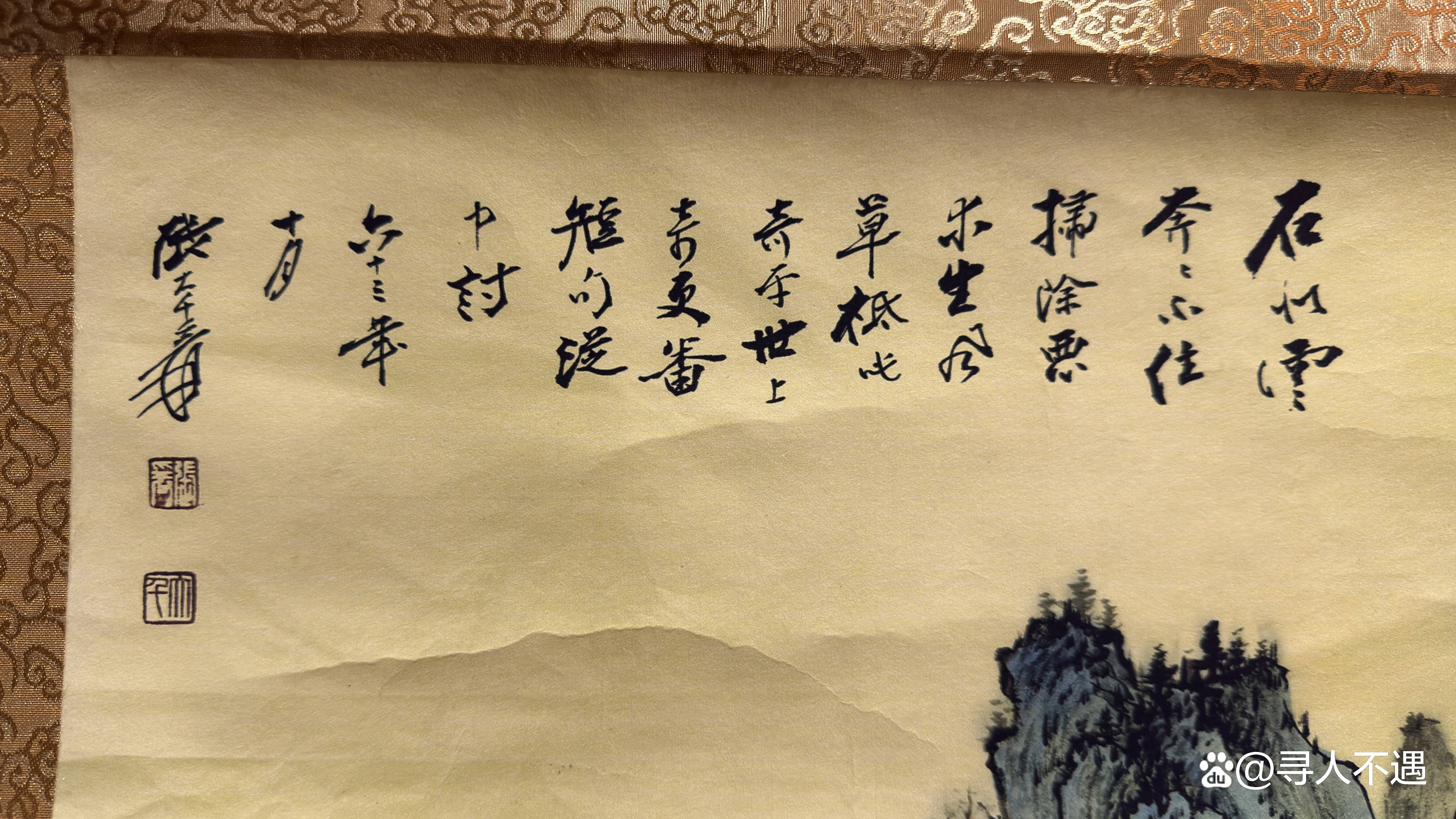 装裱锦缎纹样为民国常见四合云纹,天杆地轴工艺符合时代特征