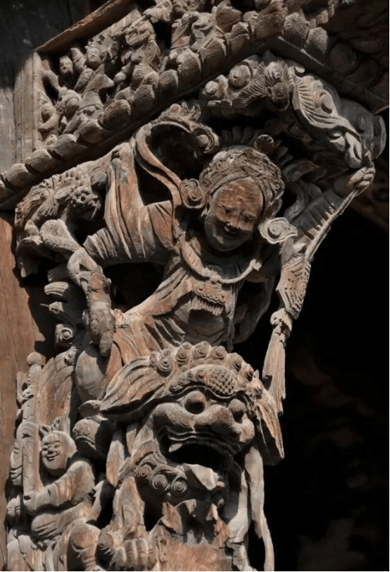 与雀替一样,牛腿也是精美雕刻的常见构件。其内容囊括历史故事、神话传说、吉祥装饰纹样等。多种多样的装饰中,除了抽象的纹样,还有具象的动物和人物雕刻。