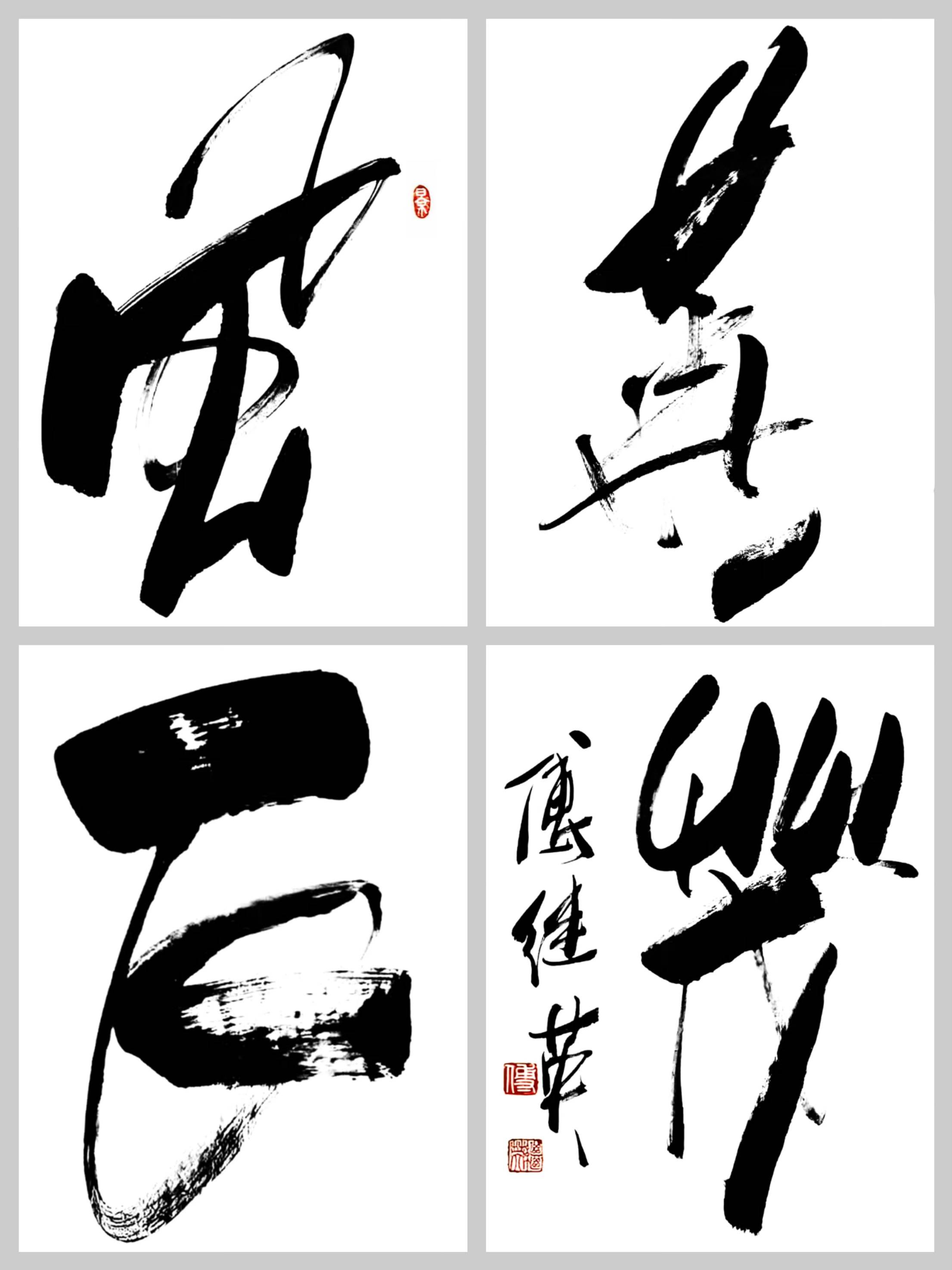“风华”本指草木的繁盛与人的才华气质。傅继英老师的书法将“风”的灵动与“华”的璀璨融为一体,笔锋如风般自由洒脱,墨色似华般浓淡相宜。在结构上,“风”字左倾右斜的布局暗含流动感,“华”字繁复的笔画通过枯笔处理形成虚实对比,既展现了青春的活力,又隐喻了才华的沉淀过程。