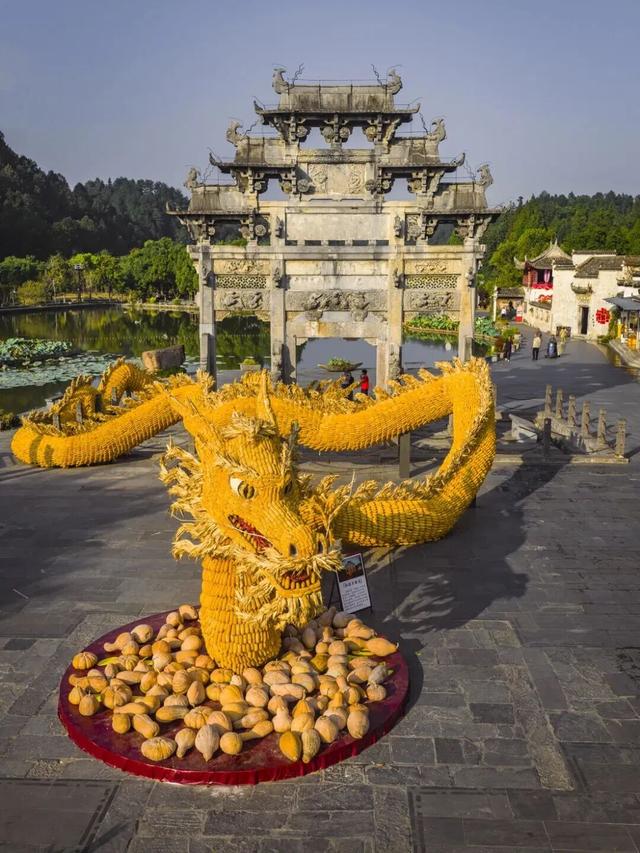 世界最佳旅游乡村黄山西递,以玉米堆砌成50米长巨龙,庆祝国庆中秋(图源/ 黟县徽黄旅游集团)