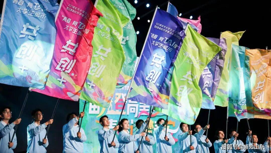 “青春有TAI度,大学生城市共创+,喊你一起来共创!”15所驻泰高校学生会主席手持着五颜六色、五彩缤纷的旗帜奔跑向舞台,代表着“共创+”项目的播种与传递,更代表着17万驻泰高校学子热情澎湃的青春激情与无限活力。响亮的口号整齐迸发,瞬间点燃全场热情,将现场氛围推向顶点。伴随这股蓬勃的青春力量,2025泰安市大学生文化艺术节暨开学季活动正式启航。