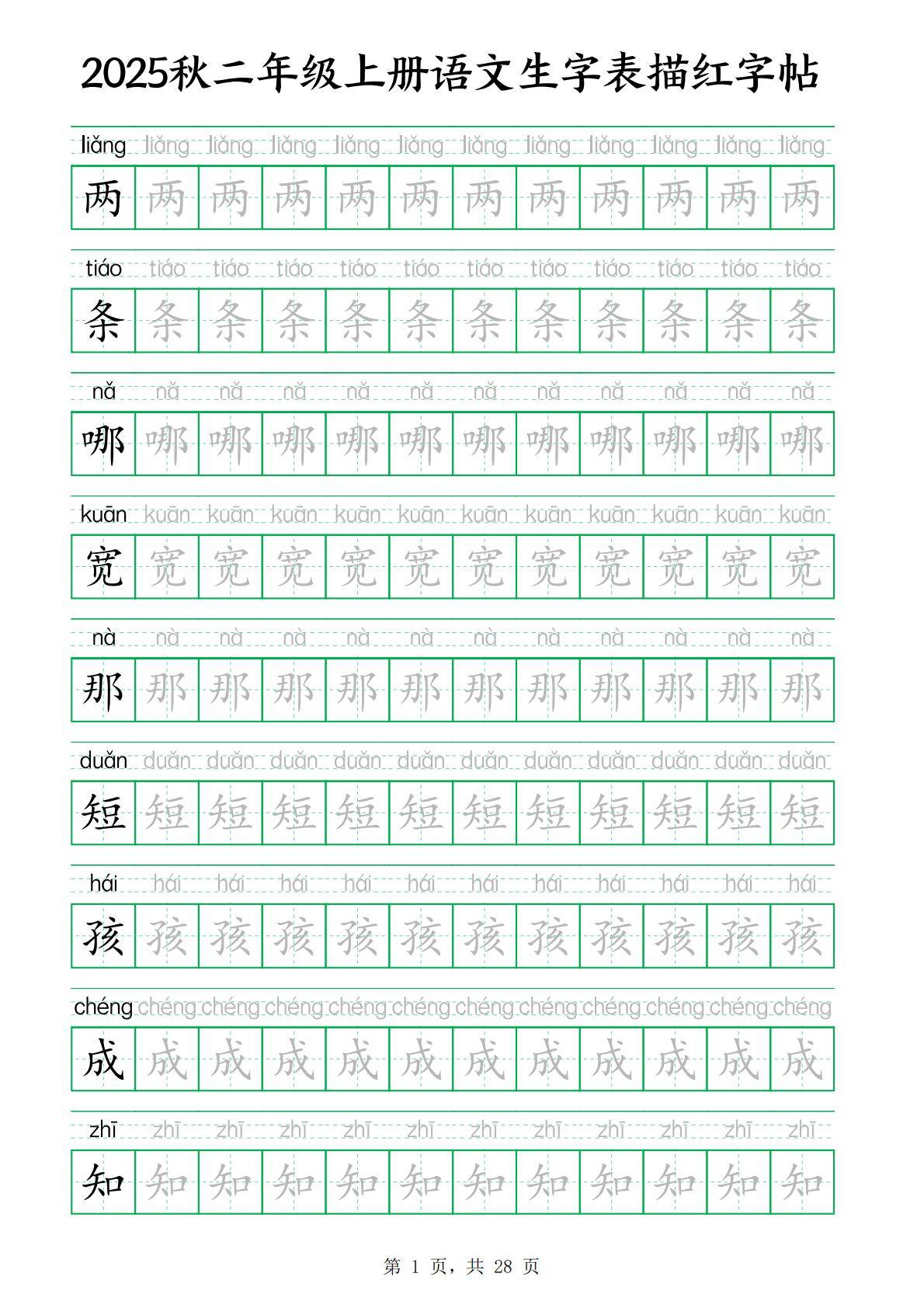 今天为大家分享:25秋新二上语文生字表生字拼音描红字帖(251字28页),二年级上册语文生字表描红字帖包含众多基础生字。像 “两”,读音为 “liǎng”,是独体字,书写时要注意笔画的分布,横画和竖画要写得规整。“条” 读音 “tiáo”,上下结构,上部的 “夂” 和下部的 “木” 要搭配协调。“哪” 读音 “nǎ”,左右结构,左部 “口” 要写得小巧,右部笔画较多,需注意间距均匀。