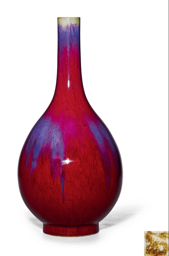 款识:“大清乾隆年製”六字三行篆书款。瓶直口,细长颈,削肩,鼓腹,圈足。因形似悬胆,故又名「胆式瓶」。器腹如梨,端庄雅丽,曲线优美,瓶颈修长挺拔,丽质非凡。通体施窑变釉,蓝紫交融,变换莫测,釉面莹润光洁并带有小晶亮点,妍丽浓烈,畅酣悦目。底刻“大清乾隆年制”六字三行篆书款,并罩施米汤状酱釉。清盛世帝王偏爱颜色釉,雍正时期唐英奉旨所烧新制色釉多于九种,窑变釉即为其中一种,乃仿宋钧釉所制。《唐英瓷务年谱长编》中记载,雍正七年三月,“派厂署幕友吴荛圃调查钧窑器釉料配制方法”,并成功烧制出这一品种,此后宫中多有谕旨命其多烧造些来,足见皇帝对窑变釉的偏爱。此种釉色因受窑温、窑内气氛及多种呈色元素等的影响,每出釉色俱不相同,可见其烧制并非易事。成交价RMB 1,322,500。