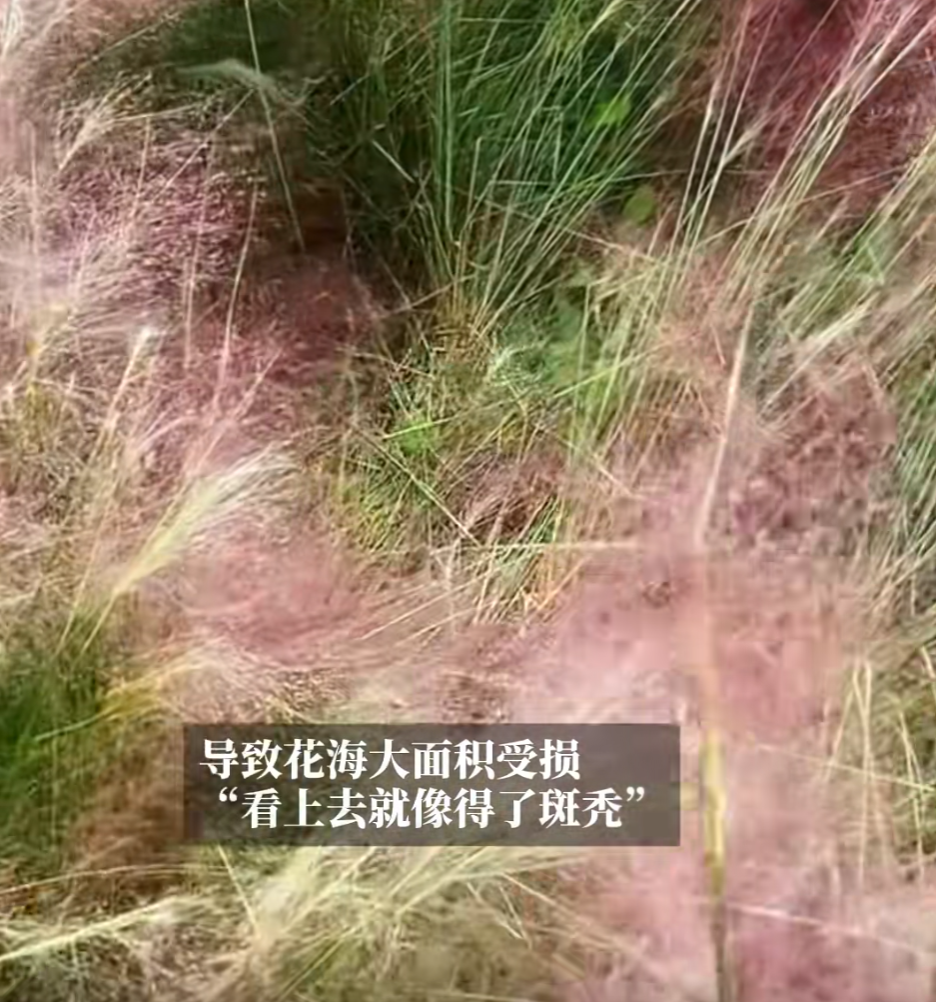 辽宁大连金石滩白鲸公园的粉黛乱子草也盛放了,但因游客频繁踩踏打卡,导致花海受损严重。