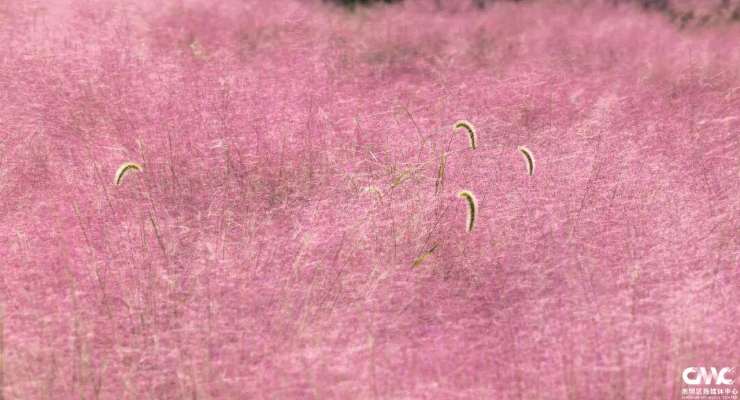 往虹桥体育公园去,天山西路入口一带,还有园区里蜿蜒的步道两侧,早被粉黛染成了一片浅红。那草茎纤细到怕被碰碎,顶着蓬松的花穗,风一吹,便软软地晃,放眼望去就像天边揉碎的粉云落了地。
