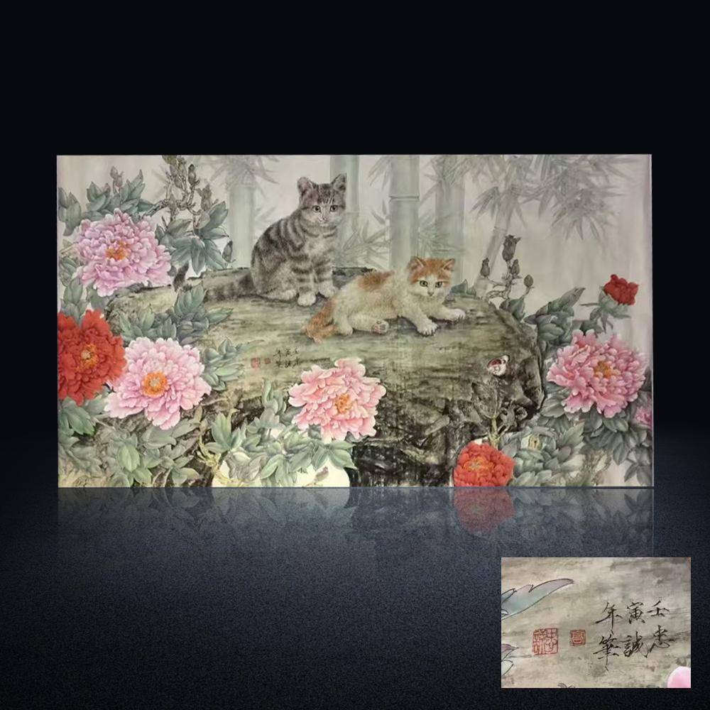 - 形制规格:纸本工笔重彩,构图饱满层次分明,牡丹、双猫与衬景相互呼应,尺幅适配家居悬挂与收藏展示,尽显典雅庄重。