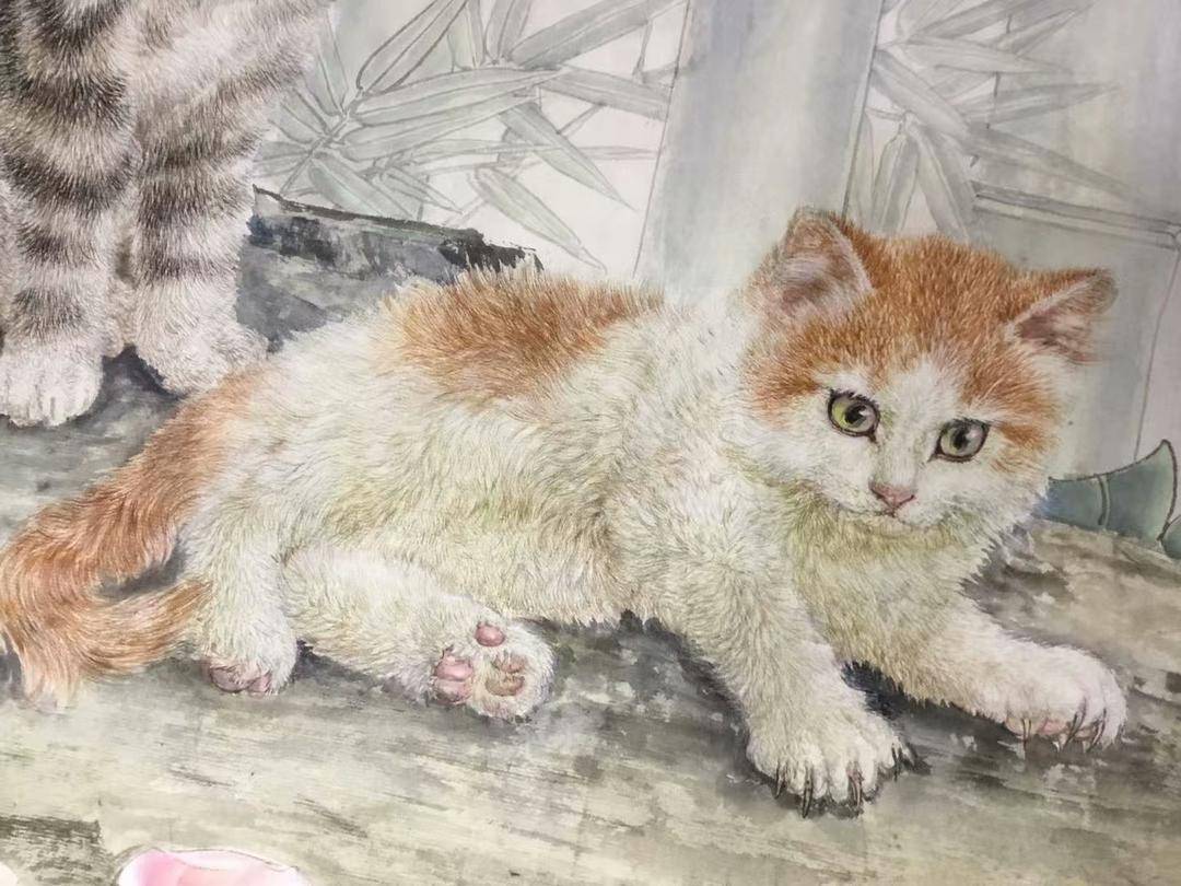 画面核心的双猫形象,体现高忠诚工笔走兽画的高深造诣: