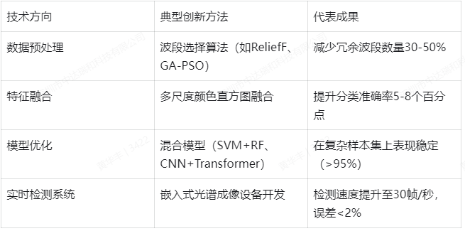 - 绿茶分类:Zhang et al. (2021) 采用5波段(470/530/610/700/800nm)成像系统,结合PCA-LDA分类器,对龙井43、碧螺春等6个绿茶品种的识别准确率达96.2%