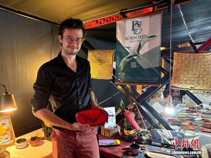10月17日晚,一位来自法国的艺术家正在陶溪川春秋大集上展示他的作品。中新社记者 李韵涵 摄