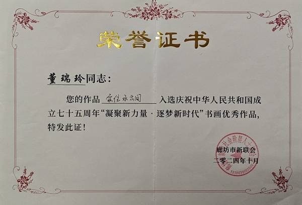2024年10月,在廊坊市广阳区宣传部、区总工会和 区文化广电旅游局共同举办的 庆祝中华人民共和国成立七十五周年书画展 暨京津冀书画名家邀请展上,作品《家住水云间》获优秀奖。