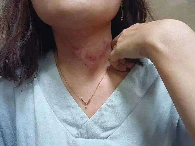 华商报大风新闻记者在薛芯出示的照片上看到,她脖子四周一片通红,并留有深深的伤痕,右脚膝盖下端一片红肿,亦有伤疤。