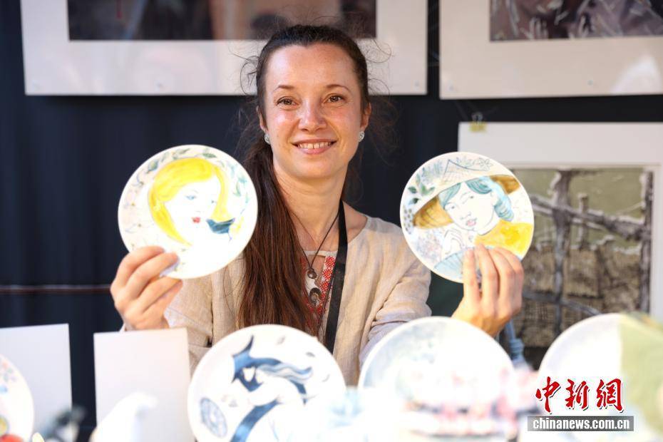 图为10月18日下午,白俄罗斯艺术家娜斯佳(Anastasiya)并置展示了两只瓷盘:左边绘有白俄罗斯传统女性图案,右边则描绘了中国传统女性形象。这种巧妙的对比,让两种文化在她的摊位前展开了一场无声的艺术对话。中新社记者 刘占昆 摄