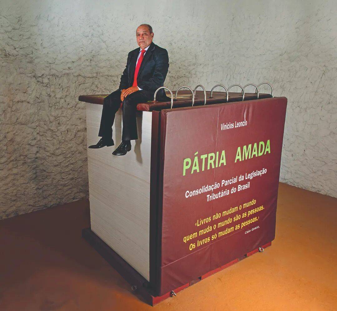 巴西律师维尼修斯·莱昂西奥坐在他巨大的作品上,以抗议巴西繁杂的税法。