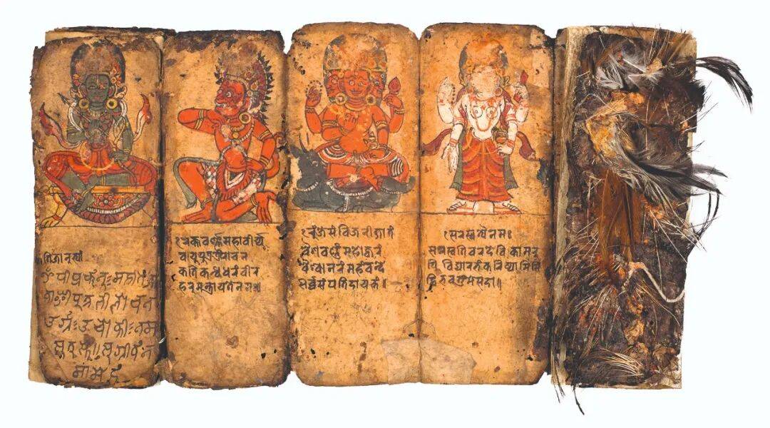 18世纪传统的尼泊尔萨满手册,内含用于驱邪的护身符和咒语。这本书的封皮被5种动物的血和皮肉碎片所包裹,也就是水牛、鸡、狗、山羊和牛,它们分别代表5种感官和5种欲望。