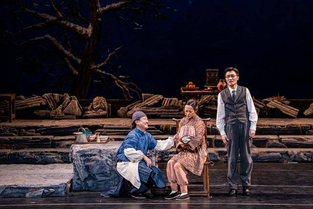 故事中的“烟火气”则体现在两处舞台设置上:垂下的纱帘幕自由展现出各种城市风貌与相关故事元素;一棵高大的树立于其中,带来坚硬又孤零的气息。舞美设计李彪说:“北京题材的戏,我绕不开这棵树,是冥冥之中的感觉。”在他一直以来的感受里,老舍先生就如这样一棵树,“孤独……又有生生不息的感觉,虽然是一棵冬天的没有树叶的树,周围环境也很寒冷,但树立在那里,是又孤独又温馨的。”