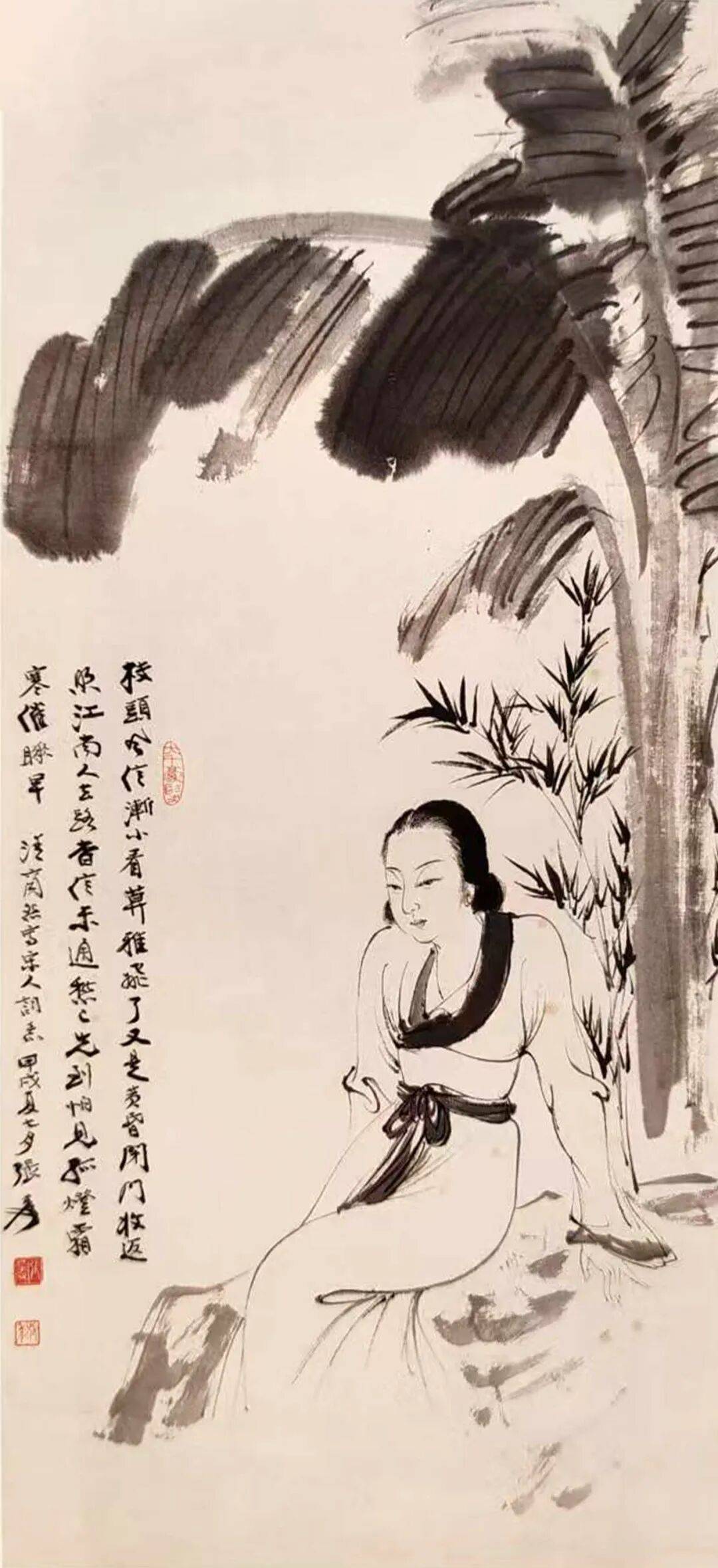 款识:清代写人物当以新罗山人为至佳,往往得晋人轻裘缓带之致,黄瘿瓢则未能脱市井气耳。予此作拟大风笔意。大千居士张爰。