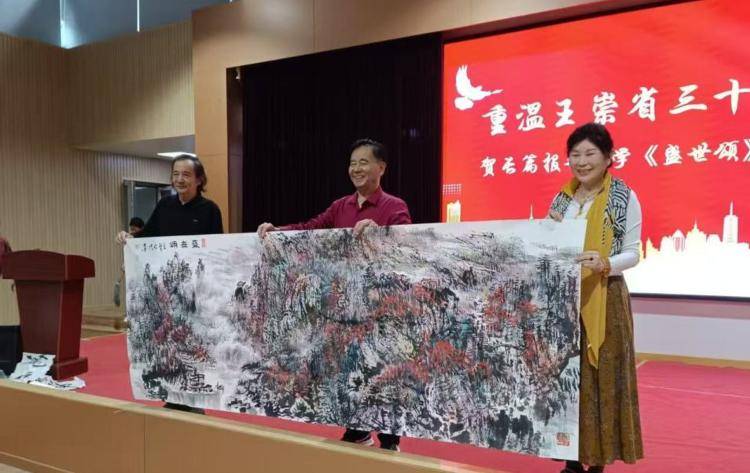 书画家们挥毫泼墨,笔走龙蛇,为此次艺术活动敬献墨宝表示祝贺。其中,在国内极具影响力的一代国画大家苏兆洪先生,以崇敬心情将其精湛的巨幅山水画卷《盛世颂》赠送王崇省,受到其热烈欢迎。