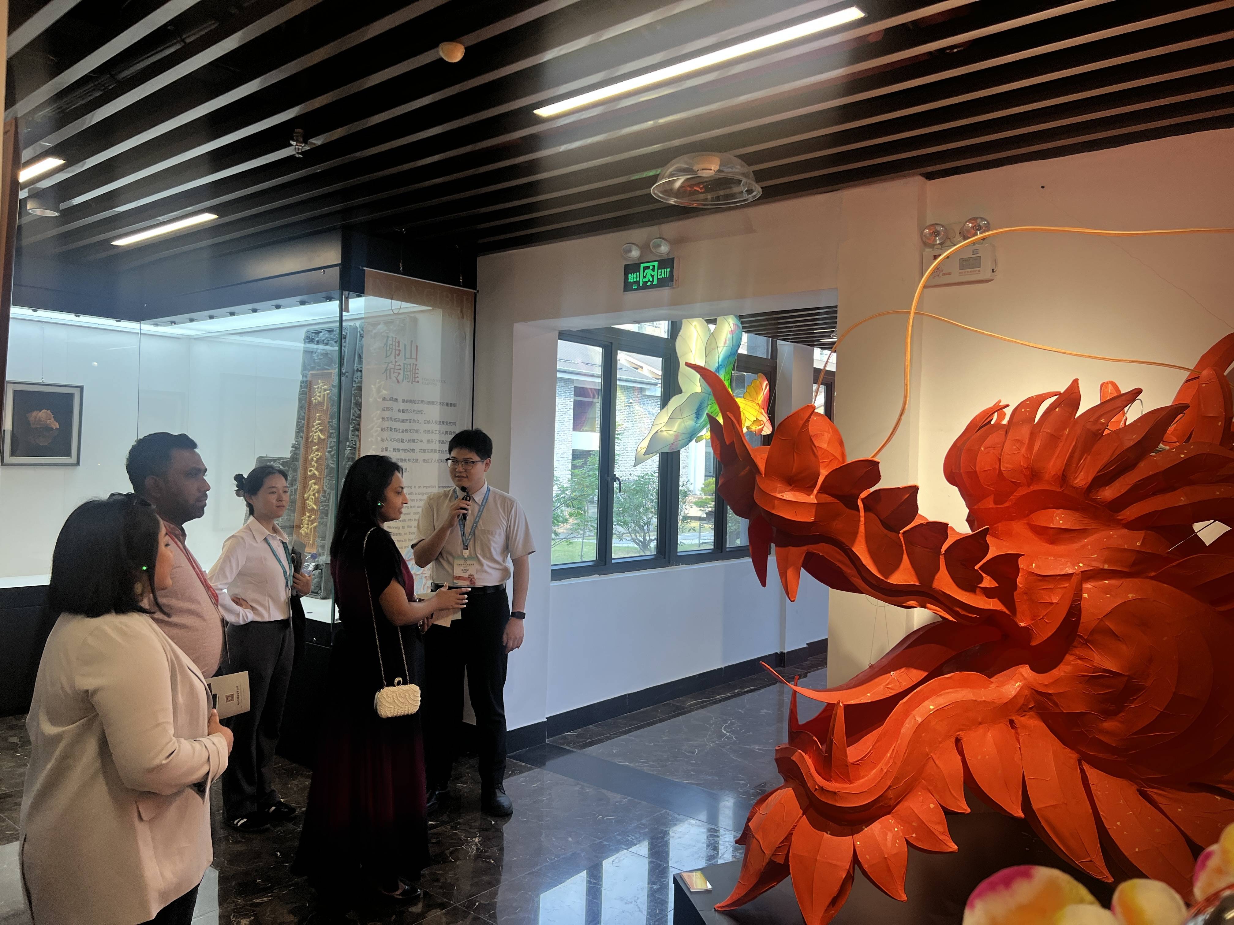 在交流和展演之余,佛山特色民间艺术精品展上的彩灯、粤剧头饰等19类102 件(套)本土特色艺术作品,吸引了代表团团员们的目光。红色剪纸造型的“佛山FoShan”二字,更成为各国代表团定格佛山记忆的经典背景,让文化交流从表演的舞台延伸至城市空间的互动。