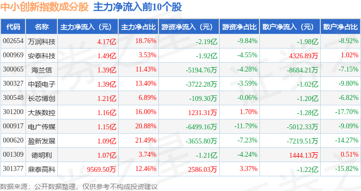 资金流向方面,中小创新(399015)指数成份股当日主力资金净流出合计22.99亿元,游资资金净流出合计15.98亿元,散户资金净流入合计38.97亿元。成份股资金流向详情见下表:
