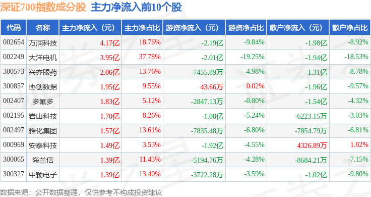 资金流向方面,深证700(399010)指数成份股当日主力资金净流出合计38.15亿元,游资资金净流出合计18.74亿元,散户资金净流入合计56.89亿元。成份股资金流向详情见下表: