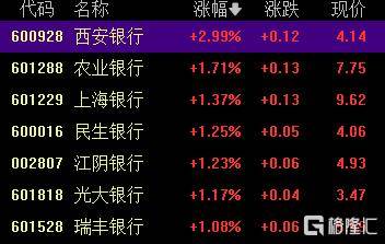 银行股震荡走高,西安银行涨近3%,农业银行探底回升涨超1%再创历史新高,走出12连阳,上海银行、民生银行等跟涨。