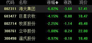 猪肉股走低,海大集团跌超6%,巨星农牧跌超4%,牧原股份、立华股份、温氏股份跟跌。