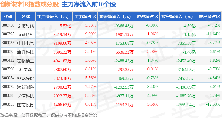 资金流向方面,创新材料R(470039)指数成份股当日主力资金净流出合计2.61亿元,游资资金净流入合计6375.59万元,散户资金净流入合计1.98亿元。成份股资金流向详情见下表: