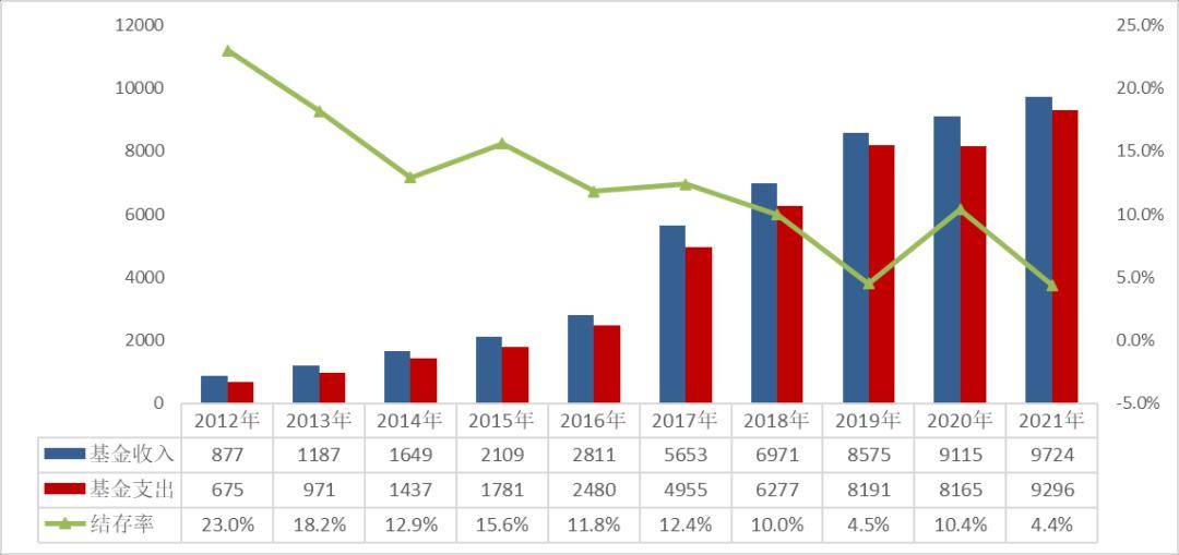 2012-2021年居民医保基金收支情况 单位:亿元 数据来源:国家医保局