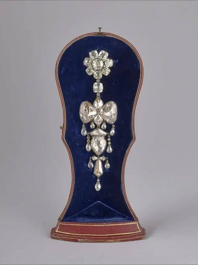 这也是一件非常著名的胸针,名字来源于胸针上使用了多颗来历颇具渊源的宝石:上方蝴蝶结由两颗硕大的粉红色钻石组成,它们被称为“Mazarins 17” 和“Mazarins 18”,是1661年红衣主教Mazarin遗赠给路易十四的18颗Mazarin钻石系列中的两颗。胸针下部的水滴形钻石是路易十四背心上的第四颗纽扣,后来又成了“断头皇后”玛丽·安托瓦内特的耳环。