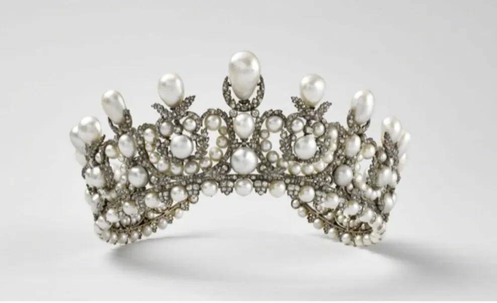 这顶被誉为“欧仁妮的珍珠头冠”的杰作,源自1853年拿破仑三世为与欧仁妮大婚时委托珠宝大师Alexandre-Gabriel Lemonnier特别打造。冠冕由212颗野生珍珠、1998颗钻石与银镀金框架组成。