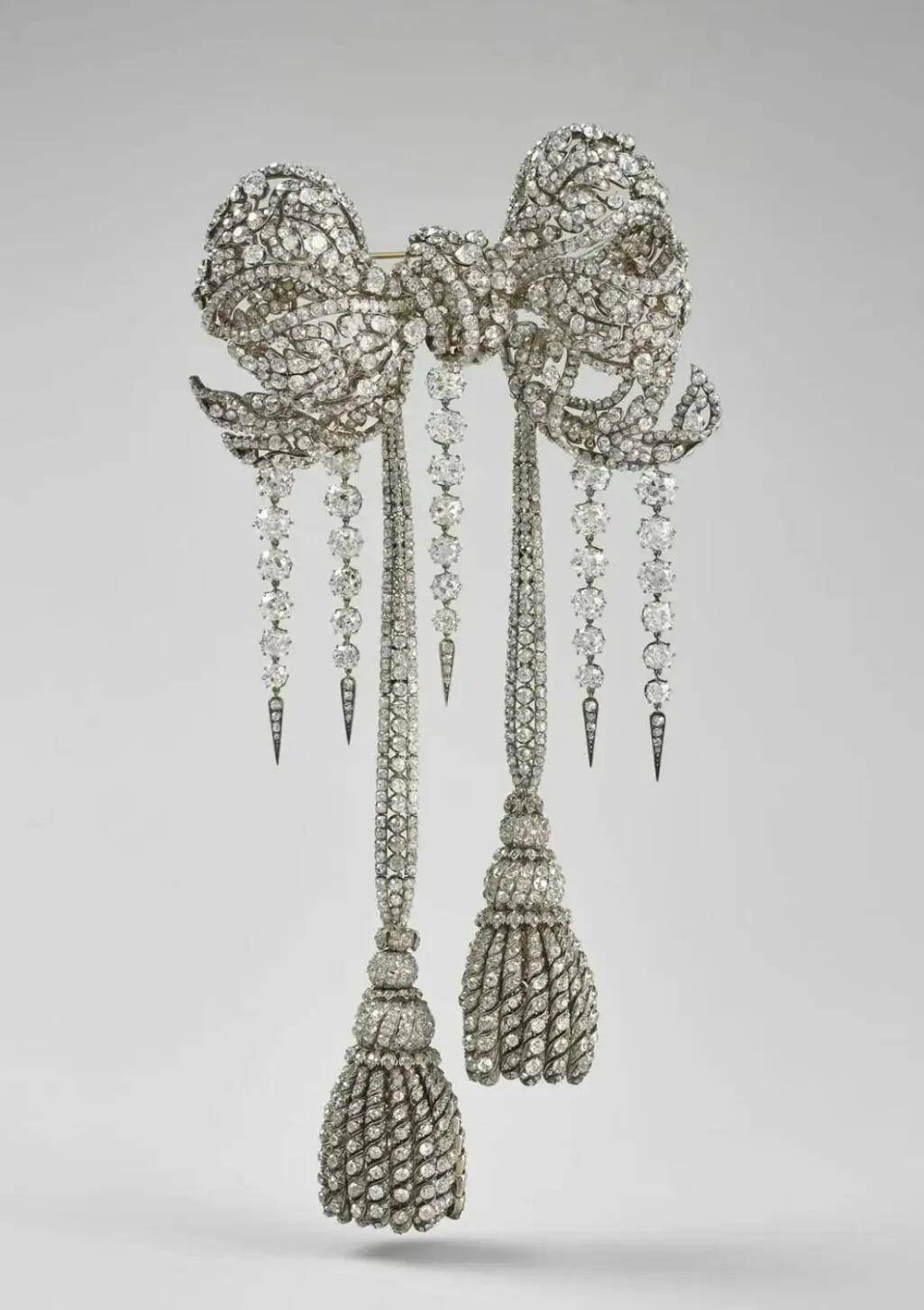 这枚蝴蝶结造型的钻饰最早是欧仁妮皇后一条钻石腰带上的蝴蝶结扣,由19世纪法国著名珠宝商Bapst工坊于1855年为其精心打造。