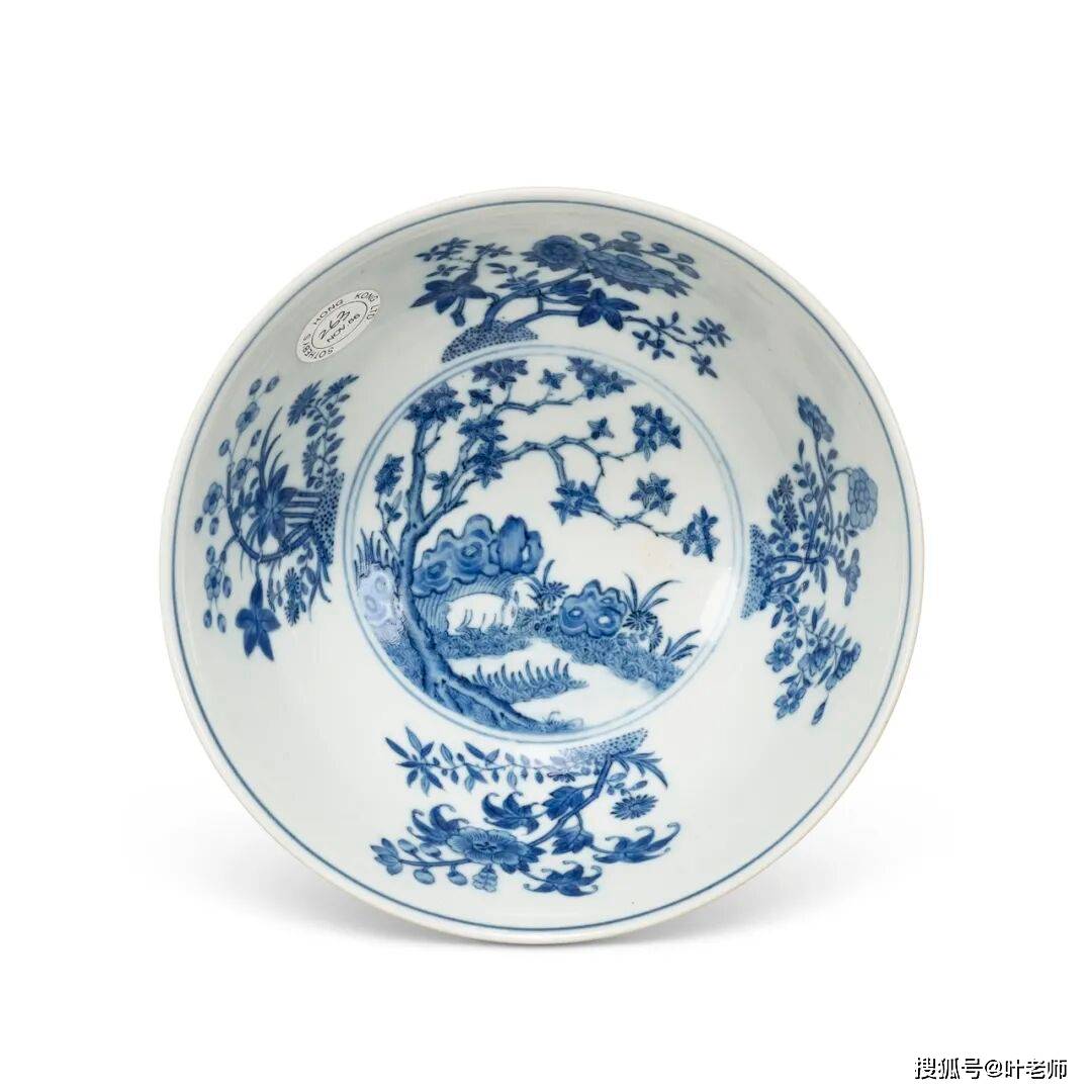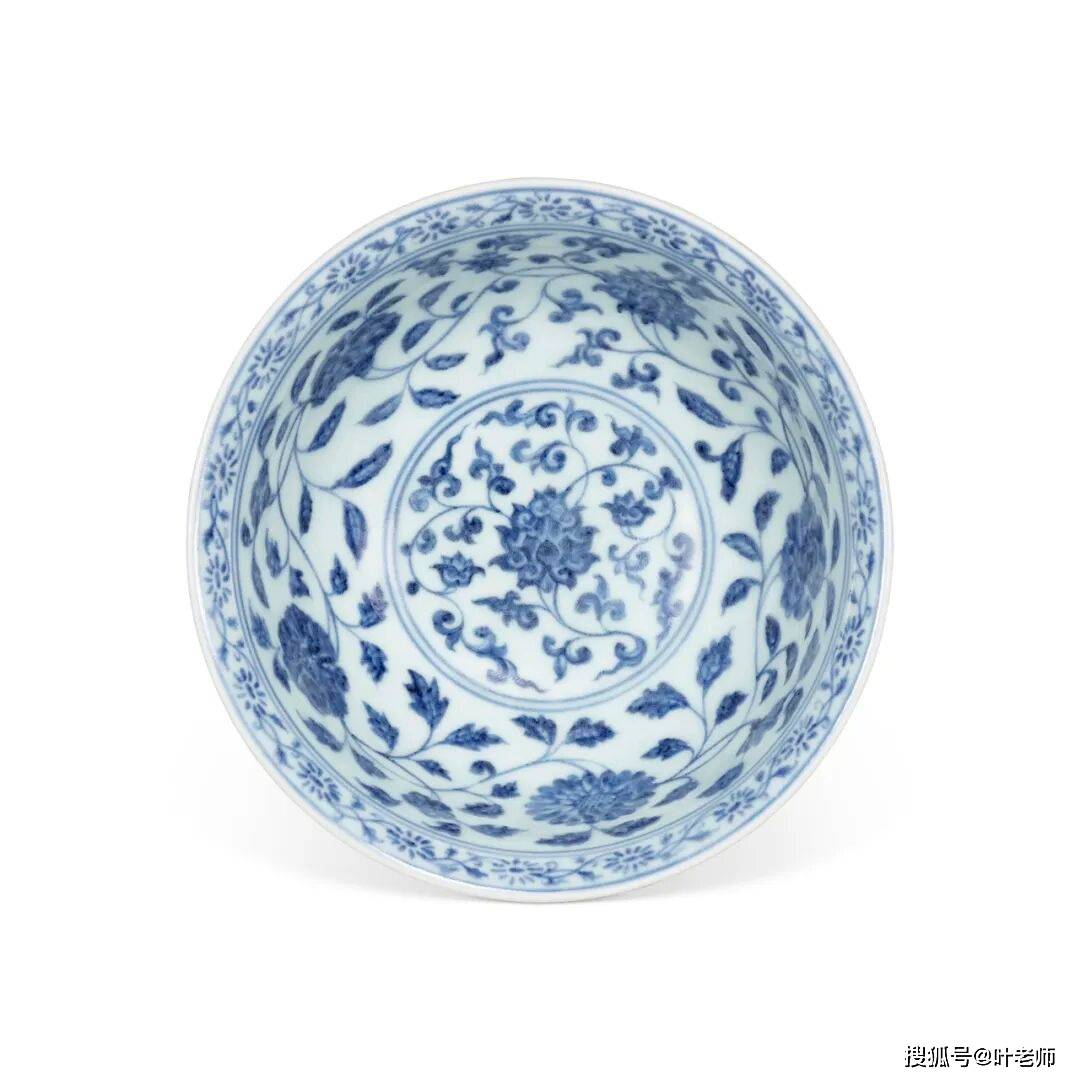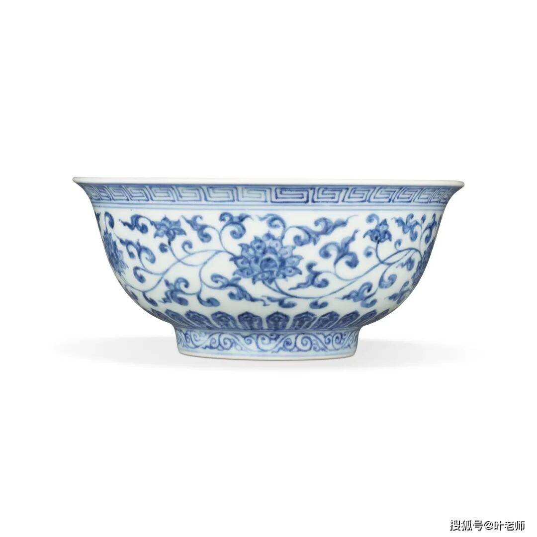 拍卖同时呈献一件明宣德青花缠枝花卉纹盌,盌弧壁,撇口,矮圈足,盌心为折枝莲花,内壁转枝牡丹、菊花、芍药、莲花及石榴花,外壁饰转枝莲花五朵,于口沿回纹及足莲瓣纹间,底书青花双圈六字款。