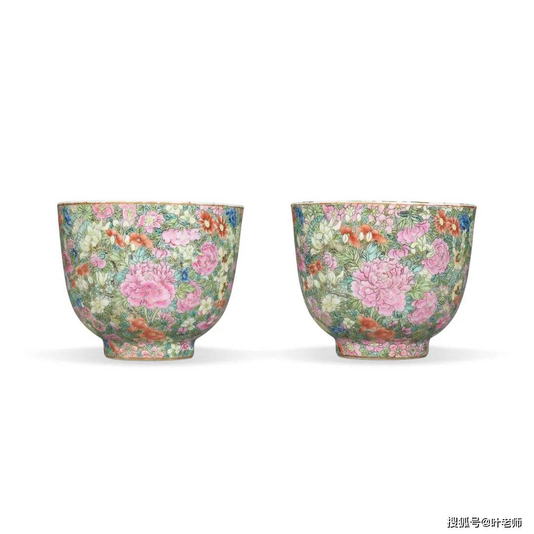 而这对粉彩万花锦纹杯,小巧玲珑,成对保存,殊为难得。外壁通体以粉彩绘纹饰,百花争艳,锦簇缤纷,色彩柔丽,层次丰富,寓意“万花献瑞”。内壁及足底施松石绿釉,匀净明亮,更衬托外壁繁花之华美,尽显盛世余韵之精巧与富丽。
