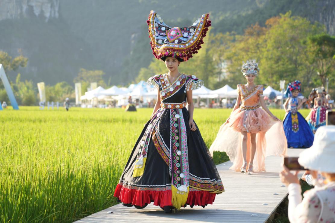 在神奇的喀斯特山水田园间,从10月18日至26日举办的明仕田园丰收季通过“丰”韵稻田、“雅”致山水、“颂”歌丰年三大沉浸式主题篇章,为游客带来丰富多元的体验:五谷丰登号竹排游、非遗市集、稻浪舞龙、水上飞人、田园研学、稻田霓裳走秀、飞天凤凰光影秀、非遗火系列演出、烟火大会等活动轮番上演,让游客在互动参与中感受丰收的喜悦,领略乡村的人文与生态之美。活动期间,还举行“缘定大新 明明‘仕’你”青年交友联谊活动。