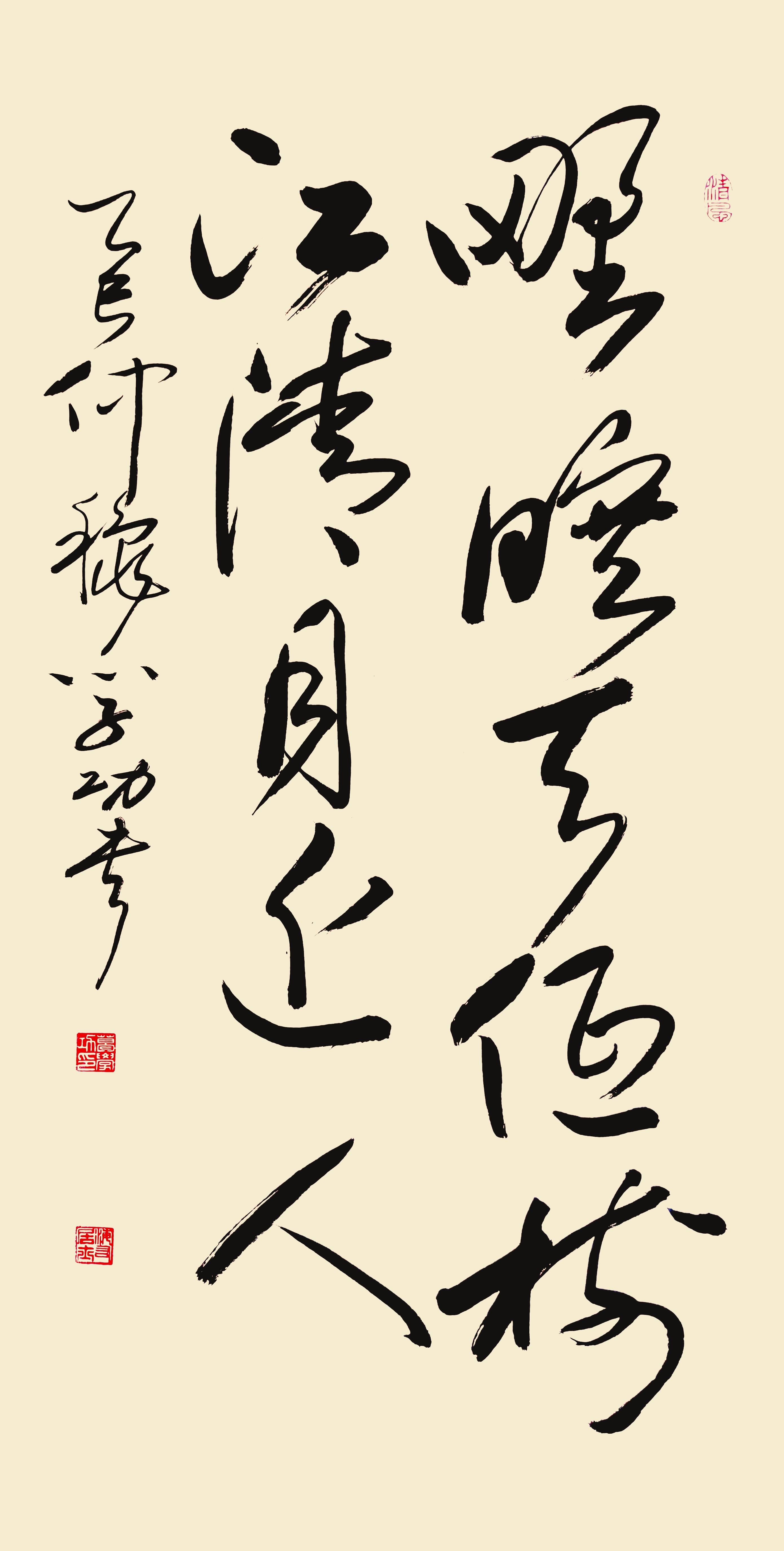 意境:空旷宁静的秋江暮色,以“野旷”“江清”的疏朗画面,烘托孤寂氛围,再借“月近人”的温情转折,形成情感张力。运用衬托(如“旷”与“低”的视觉对比)和拟人(明月“近人”),实现情景交融,含蓄传递愁绪与慰藉的交织。真是妙极了。 下面是我的原创作品草书“野旷天低树,江清月近人”。