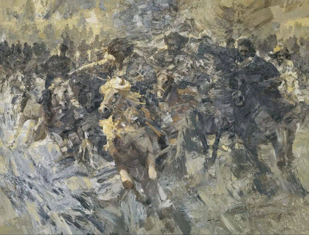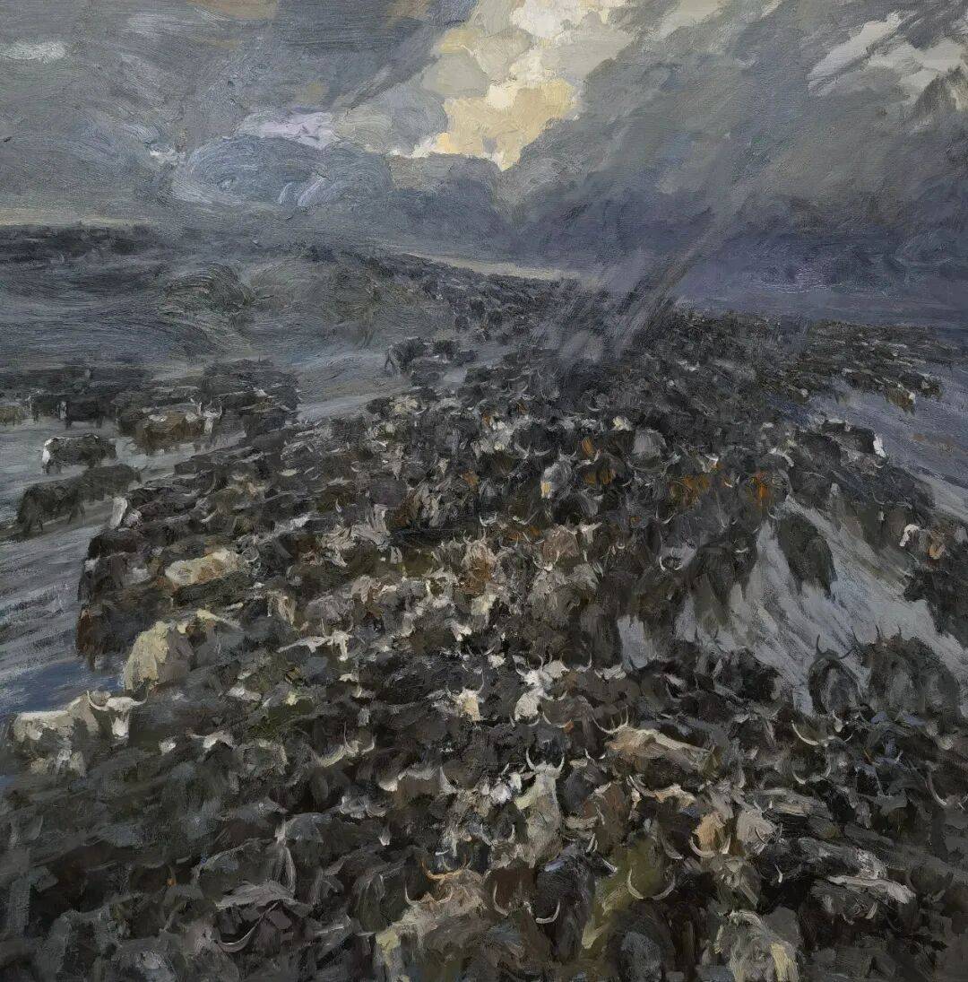对于现代风格的汲取表现在构成与视角,他常常采用大胆的构图,如极具形式感的切割、特写式的镜头语言,这吸收了现代构成的意识。突出的表现性色彩与笔触是他的色彩并非完全客观再现,而是带有强烈的主观表现性,用以烘托情绪。他的笔触在严谨中透露出书写性的挥洒,尤其是在表现环境(如风雪、山川)时,充满了表现主义的张力,增强了画面的视觉冲击力和艺术感染力。