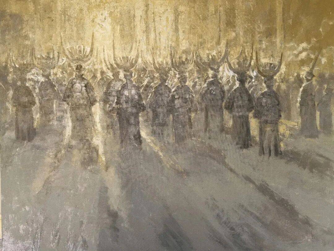 他尤其擅长运用光影。一束穿透云层照亮巡逻小队的“舞台光”,或是夕阳将战士身影无限拉长的“雕塑光”,这些都不是纯粹的自然主义描绘,而是赋予了平凡场景以神圣感和史诗性,将瞬间凝固为永恒。