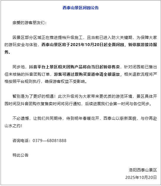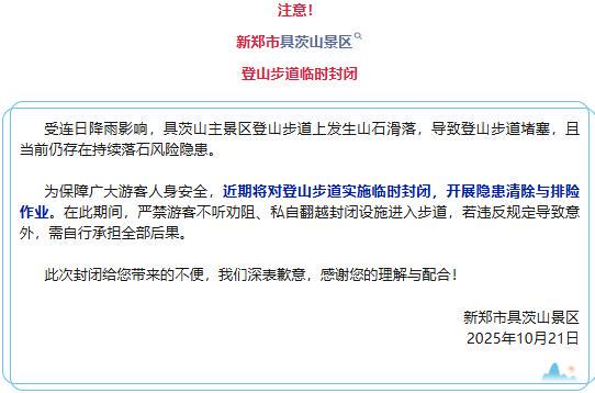 记者从洛阳西泰山景区、新郑市具茨山景区获悉,两大景区近期将先后封闭。其中,西泰山景区因部分区域提档升级施工及进入防火关键期,为保障游客安全与游玩体验,自10月20日起全面闭园,暂停旅游接待;具茨山主景区受连日降雨影响,登山步道发生山石滑落并堵塞,且存在持续落石风险,为保障游客人身安全,自10月21日起对登山步道实施临时封闭。