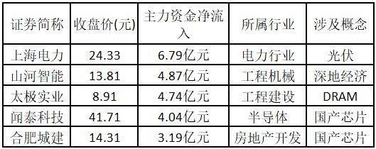从主力资金来看,今日涨停板个股中,主力资金净流入金额排名前5的个股分别为上海电力、山河智能、太极实业、闻泰科技、合肥城建。