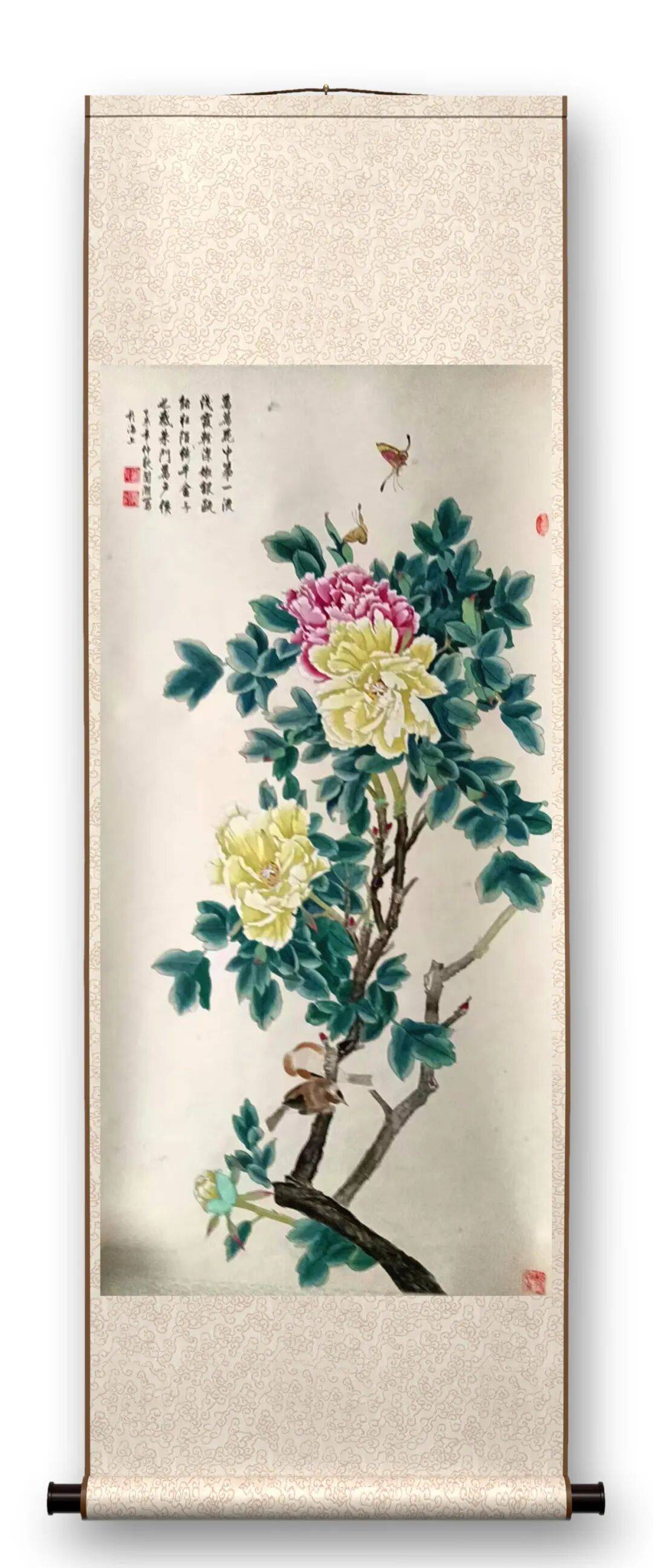 细赏其牡丹画作细节,枝茎或色或墨,健劲有力,穿插得体,疏密有致;花瓣丰富多变,分明清晰,滋润融洽。为求画面稳定脱俗,先生以水墨画叶子,压住色彩的 “火爆” 局面,达成视觉上的色彩平衡。用色时,中锋、侧锋、逆锋、拖笔等多种笔法灵活运用,使得画面 “艳而不俗”,富于变化。如此匠心,造就了他笔下牡丹苍劲厚重、健实朴茂的独特气质,书卷气十足,令人过目难忘。