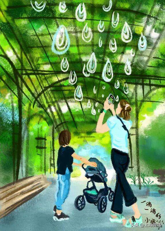 公园散步的外国妈妈抬头望向绿色长廊,一闪一闪的雨滴对着路人眨眼睛。拿起手机记录下这璀璨的一瞬间,千万别错过。