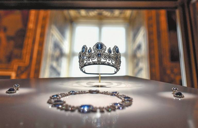 这是2020年1月14日在法国巴黎卢浮宫的阿波罗长廊拍摄的法国国王路易·菲利普的王后玛丽-阿梅莉和拿破仑三世的母亲奥尔唐丝都使用过的冠冕、项链和耳饰。 新华社/法新