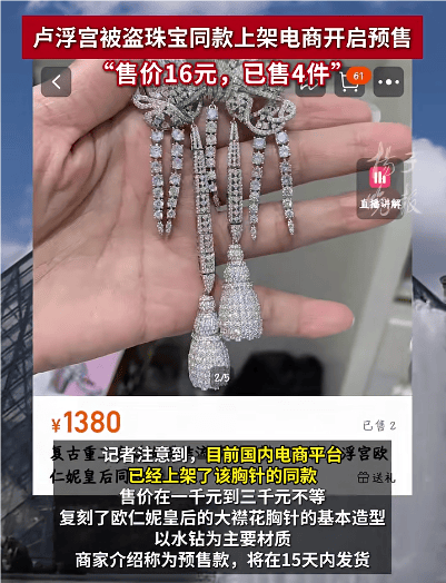 当地时间10月19日,卢浮宫博物馆遭遇盗抢,8件珠宝被盗。其中欧仁妮皇后的大襟花胸针因为造型非常别致美观引起了不少网友讨论,记者注意到,目前国内电商平台已经上架了该胸针的同款,售价在一千元到三千元不等,复刻了欧仁妮皇后的大襟花胸针的基本造型,以水钻为主要材质,商家介绍称为预售款,将在15天内发货。该胸针于1855年设计制作,镶嵌有2438颗明亮式切割钻石,整体为蝴蝶结造型,非常璀璨夺目。在1887年的拍卖会上,这枚胸针以42000法郎的价格被卖给了珠宝商埃米尔·施莱辛格。施莱辛格很快就将它卖给了卡罗琳·阿斯特夫人。胸针一直被阿斯特家族收藏了百年。2008年该胸针在佳士得拍卖会上现身。在经过一番协商后被卢浮宫购得。
